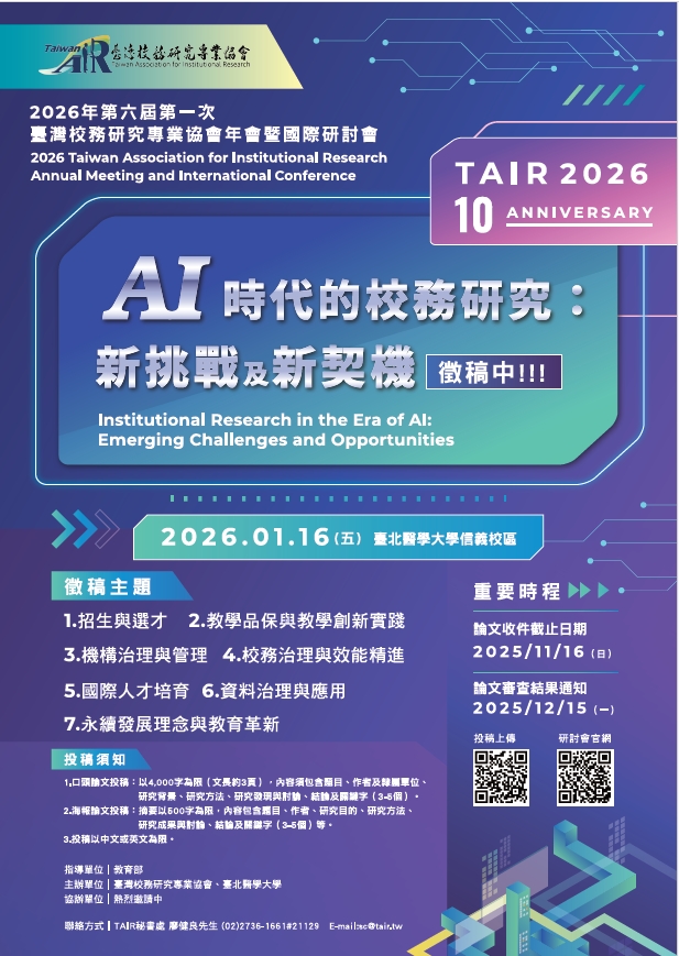函轉-臺灣校務研究專業協會辦理「2026第六屆第一次臺灣校務研究專業協會年會暨國際研討會-AI時代的校務研究:新挑戰及新契機」論文徵稿訊息